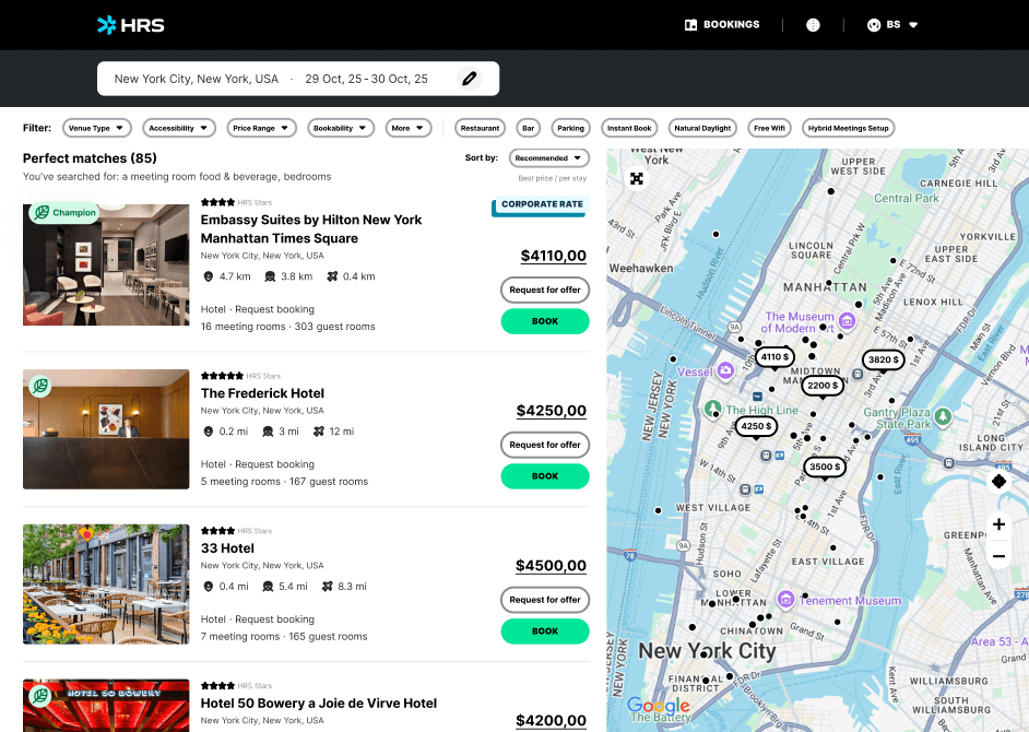 Showcase your meeting spaces to global corporates through HRS Connect. Upload your data once, and our AI ensures full visibility across corporate sourcing and booking tools—for faster, smarter meeting bookings.