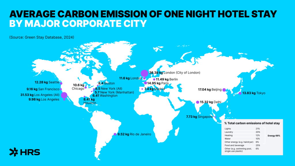 HRS’ 2024 Sustainability Report shows corporate hotel clients cut lodging-related carbon emissions by 27 %.